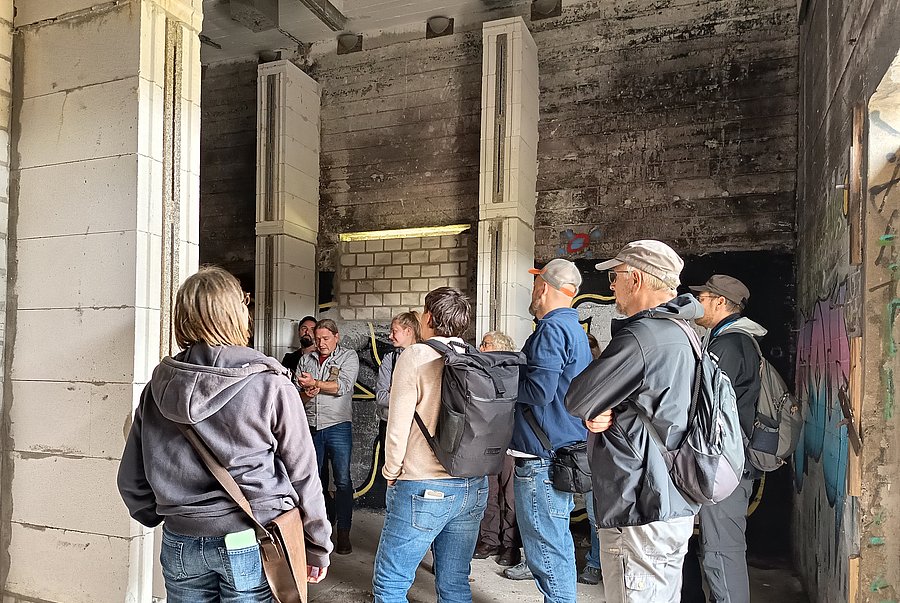 Auf einer Exkursion am Nachmittag stellten René Seifert und Matthias Göttsche großräumige Gebäudequartiere vor, die im letzten Herbst durch das Bündnis Naturschutz im Rahmen des Triko-Projektes auf Flächen der Stiftung Naturschutz Schleswig-Holstein in Schafstedt eingerichtet wurden. Verschiedene Spalten bietende Strukturen in den Gebäuden ermöglichen künftig eine Winterquartiernutzung. Kästen sowie Bleche an der Außenfassade dienen unterschiedlichen Arten als Sommer- und Zwischenquartier. Neue Offenbodenstellen und Wildpflanzenansaaten mit Regio-Saatgut in der umgebenden extensiven Weidelandschaft erhöhen zusätzlich die Attraktivität als Jagdhabitate und dienen zugleich weiteren Zielarten, wie der Zauneidechse.