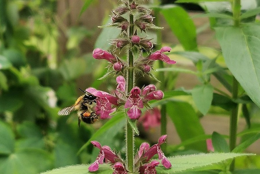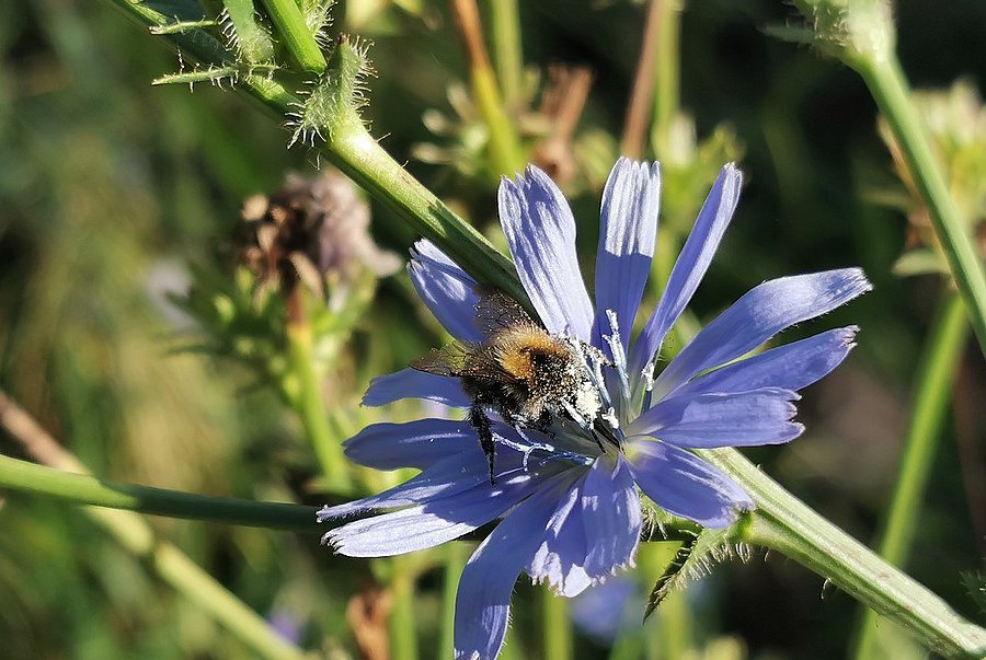Gut 3.500 heimische, regio-zertifizierte Wildpflanzen, die von hiesigen Staudengärtnereien produziert wurden, sollen auf den ausgewählten Projektflächen mehr Nahrung für Insekten liefern. Dabei geht es nicht nur um den Nektar der Blüten. Viele Raupen heimischer Tag- und Nachtfalter sind sehr spezialisiert und benötigen bestimmte Futterpflanzen. Der Hauhechel-Bläuling beispielsweise legt seine Eier an verschiedene Kleearten, wie u.a. den Hornklee. Sind die Raupen geschlüpft, sitzen sie quasi direkt auf ihrer Leibspeise. Den knapp 300 in Schleswig-Holstein vorkommenden Wildbienen-Arten geht es vornehmlich um Pollen, den sie auf den Wildblumen sammeln und als dicke Pollenpakete zu jedem Ei in die Brutzelle packen. Je nach bevorzugter Wildblume kann das auch mal blau aussehen.
